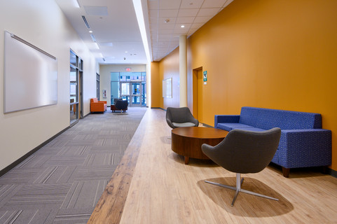 The first floor is dedicated to the business school. The goal was to create interactive, technology spaces, that allow the students to prosper in their career paths. The large commons area is divided by a technologically advanced glass, allowing privacy for meetings with the flip of a switch, turning the glass opaque. Ticker tape lines the walls, keeping students up to date on current events and news-stories. This newly designed building also adds a second point of entry to the school, allowing for easier access and parking.